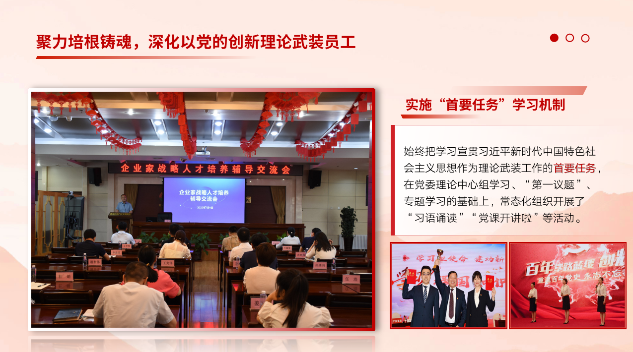 近年來,集團(tuán)黨委堅(jiān)持把思想政治工作作為一項(xiàng)經(jīng)常性、基礎(chǔ)性工作來抓,融入現(xiàn)代企業(yè)治理、經(jīng)營管理、企業(yè)文化建設(shè)、員工隊(duì)伍建設(shè),形成了全員、全程、全覆蓋的國有企業(yè)大思政模式,有效發(fā)揮了“生命線”的獨(dú)特作用,推動(dòng)了企業(yè)高質(zhì)量發(fā)展。實(shí)施“首要任務(wù)”學(xué)習(xí)機(jī)制,實(shí)施核心價(jià)值培育機(jī)制,實(shí)施企業(yè)文化熔鑄機(jī)制,推動(dòng)愛國主義、集體主義、社會(huì)主義教育深深融入員工血脈,厚培員工以企為家、愛企如家的歸屬感和凝聚力。