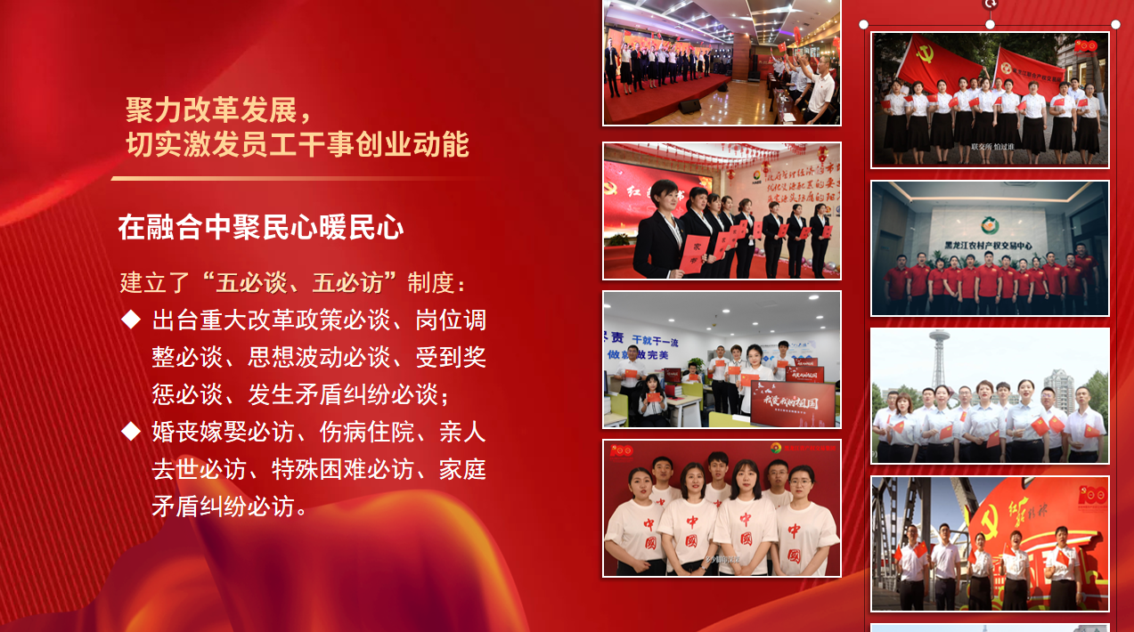 集團(tuán)黨委還引導(dǎo)黨員員工開展自主教育,組織開展“四愛四創(chuàng)”主題思想教育、“提質(zhì)增效、黨員先行”主題實(shí)踐活動(dòng)和“我為集團(tuán)發(fā)展獻(xiàn)一策”建議征集活動(dòng),充分激發(fā)員工“主人翁”意識,通過發(fā)揮思想政治工作統(tǒng)一思想、凝聚共識的重要作用,推動(dòng)集團(tuán)不斷實(shí)現(xiàn)高質(zhì)量發(fā)展,為龍江全面振興全方位振興貢獻(xiàn)了平臺力量。