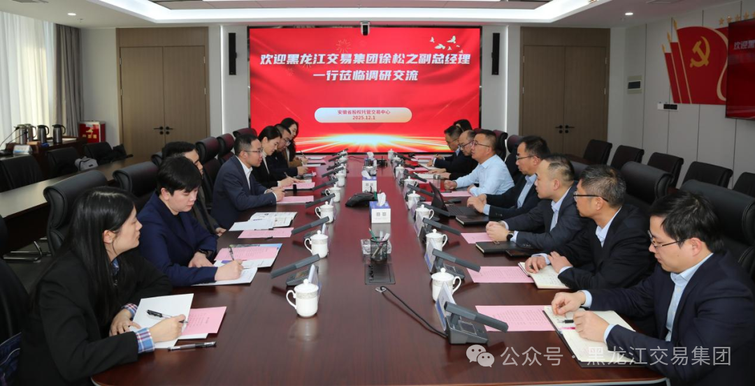 近日,黑龍江交易集團副總經(jīng)理徐松之帶隊,黑龍江股權(quán)交易中心(以下簡稱“龍江股交”)相關(guān)負責人及業(yè)務(wù)骨干一行,赴安徽省股權(quán)托管交易中心(以下簡稱“安徽股交”)開展專題調(diào)研學習。安徽股交董事長孫方剛、龍江股交董事長王艷出席座談會,雙方相關(guān)業(yè)務(wù)部門負責人參加交流。