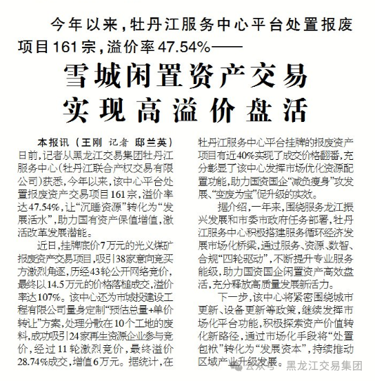 日前,記者從黑龍江交易集團(tuán)牡丹江服務(wù)中心(牡丹江聯(lián)合產(chǎn)權(quán)交易有限公司)獲悉,今年以來,該中心平臺處置報(bào)廢資產(chǎn)交易項(xiàng)目161宗,溢價(jià)率達(dá)47.54%,讓“沉睡資源”轉(zhuǎn)化為“發(fā)展活水”,助力國有資產(chǎn)保值增值,激活改革發(fā)展?jié)撃堋?